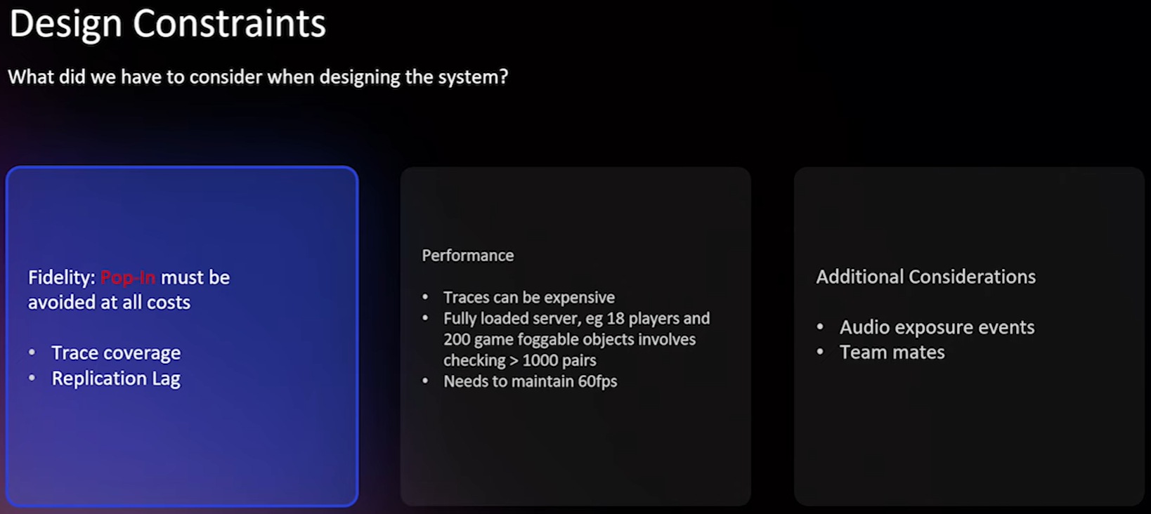 On the flip side of fidelity is server performance. like if you think about a fully loaded server with 18 players and 200 game objects, that's like thousands of of pairs. And if you multiply that by number by say eight or line traces per pair, that would quickly overwhelm the server. And we aim to hit 60 frames per second on the server. So that's we need to try and think about how to avoid that. And we also need to replicate audio. So we want to be able to hear players we can't necessarily see. And we want to make sure that teammates are still unfogged relevant to one another. so the first thing to notice we obviously don't need to perform a line of sight check every frame.