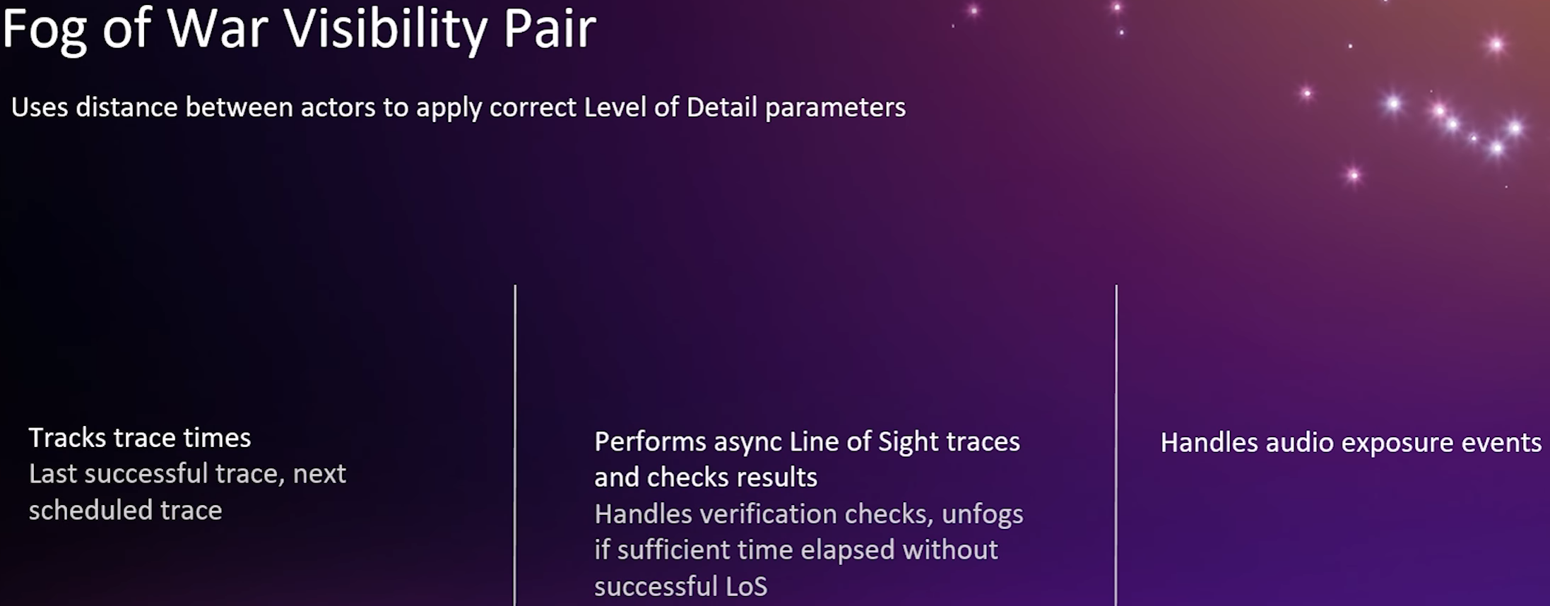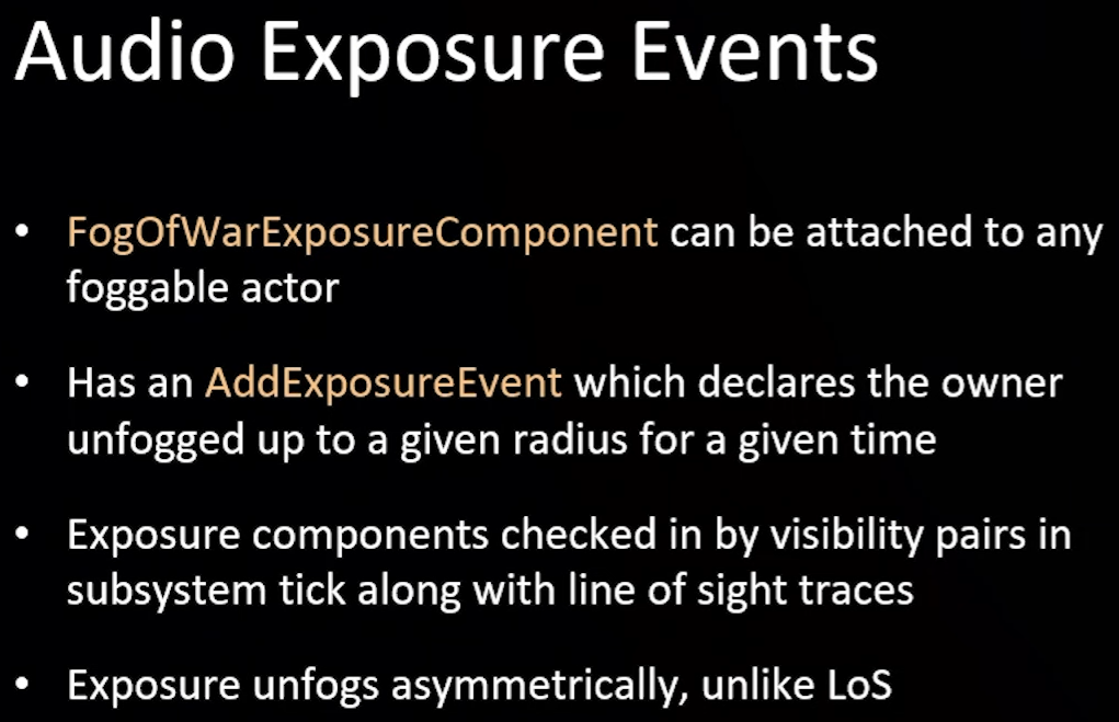 audio exposure events we implement with a component that can be attached to any actor and it has a a function for adding an event which declares that owner unfogged for the appropriate time. exposure events unfog just one member of the pair and line of sight which unfogs both and the custom replication node that we implemented it's based on epics dynamic spatial frequency rep graph node it which dynamically modifies replication frequency of actors depending on how far they away from the player. we implemented that node and moved the dynamic spatial frequency calculations to a background task because which saves a fair bit of time on the game thread and it also looks for fog of war events and uses them in deciding whether or not to replicate an actor.