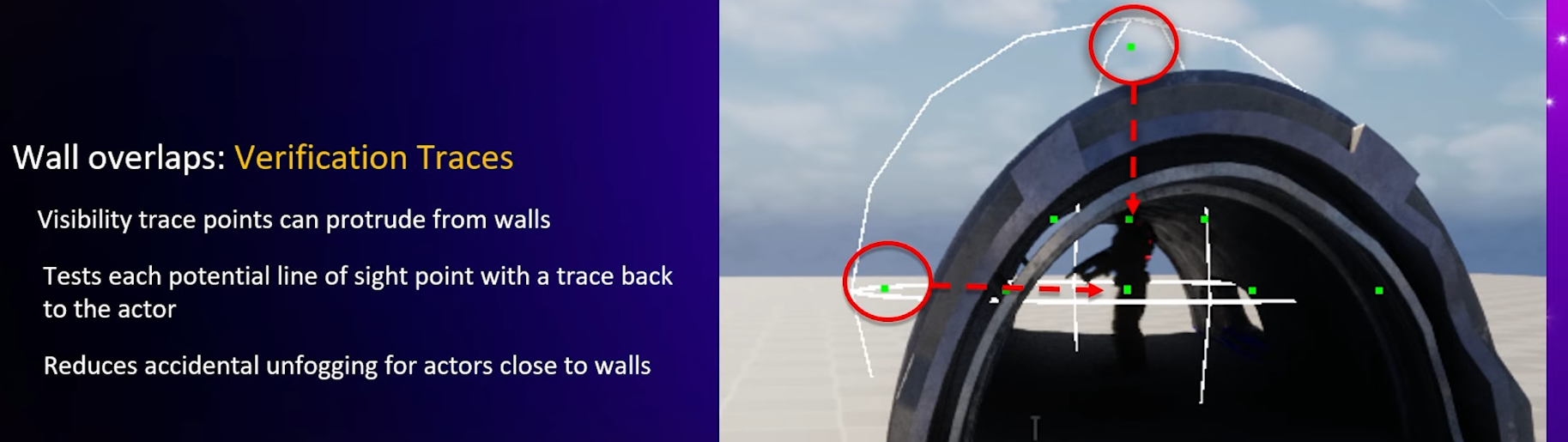 It's worth bringing up the need to perform extra checks because to bring up example of this guy standing in this little half pipe. You can see that some of the visibility points that we're using are actually outside of the the walls that they're standing in, they overlap, which means for players standing next to them, next to the wall, this player would be this NPC would always be unfogged. So, we add a second check to verify that any point that establishes a line of sight can be traced back to the parent actor. so every line of sight check actually requires two traces to confirm that they should be unfogged, it's very helpful for reducing accidental unfogging.