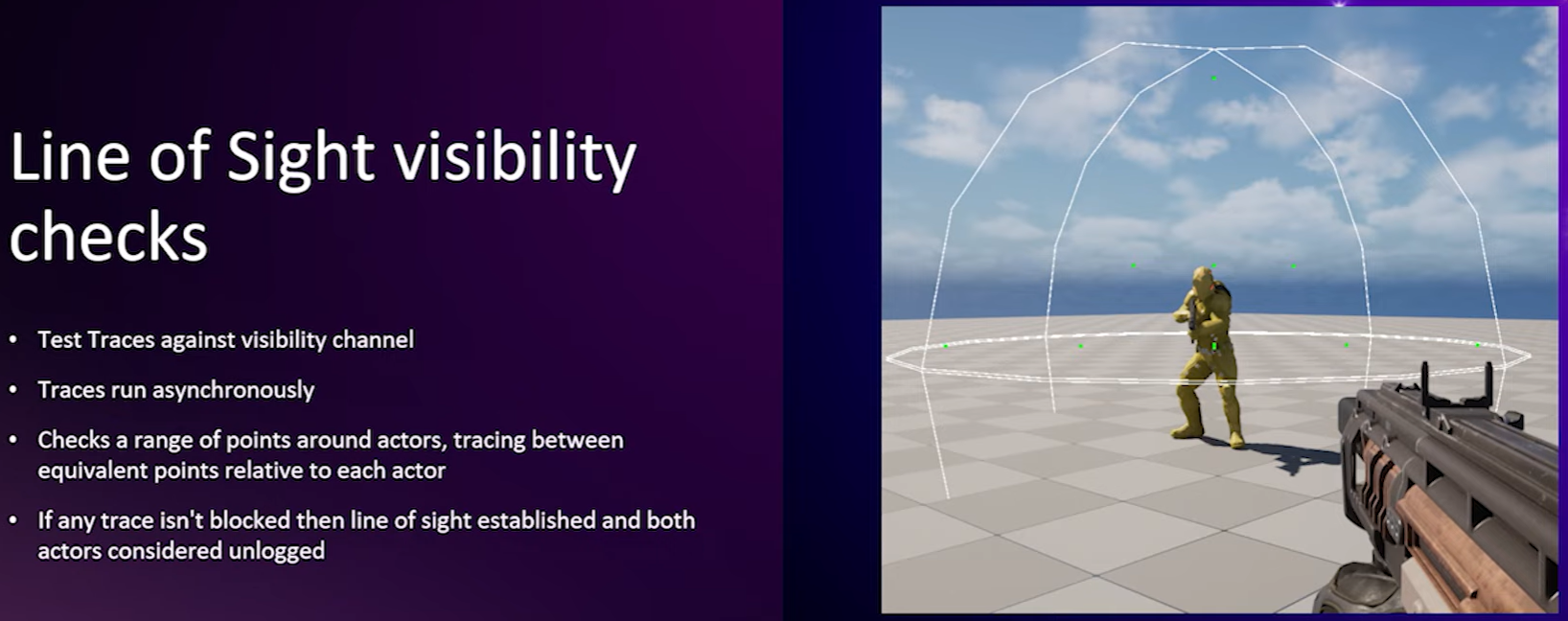 taking visibility first, the question becomes of all the game objects in the world, which ones does the player have line of sight on? So we use server-side line traces to establish line of sight. by continually tracing between the player and other actors and finding out where traces get blocked, we can determine whether that actor should be replicated for player. the image here is a screenshot showing some fog of war debug visuals around an NPC. hopefully you can make out the little green dots in the image. They show the location of where line traces are being made around the NPC to equivalent points around the player. we make traces on the visibility channel and they run asynchronously to not block the game thread and we use simple test traces because we don't care about what blocks the trace only whether it is. If any line traces are not blocked, then line of sight is established and the NPC is considered unfogged relative to the player and vice versa if it's a player. for example, since all the line traces here are not blocked, the NPC is being replicated. And here's a short video showing this in action. So, there are some NPCs hiding in this geometry. and marked with bright red line to show when they're being replicated. And as we glimpse them across the halfpipe through the window, we can see that the actors are appearing on the client, but when they move out of view, they stop being replicated. So, it kind of keeps their position hidden unless we can see them.