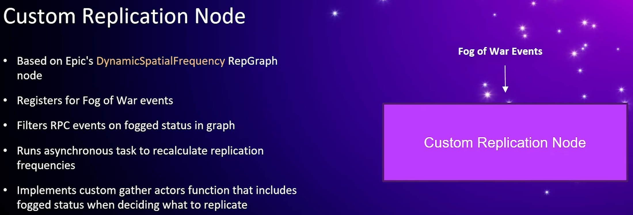It also we also have a a custom replication graph which instantiates this node and we found it we had to filter RPC events on the on the fog status of an actor prevent issues where sending an RPC event to an actor that is fogged would briefly create that actor on the client and then uninstantiate them after the all have been processed.