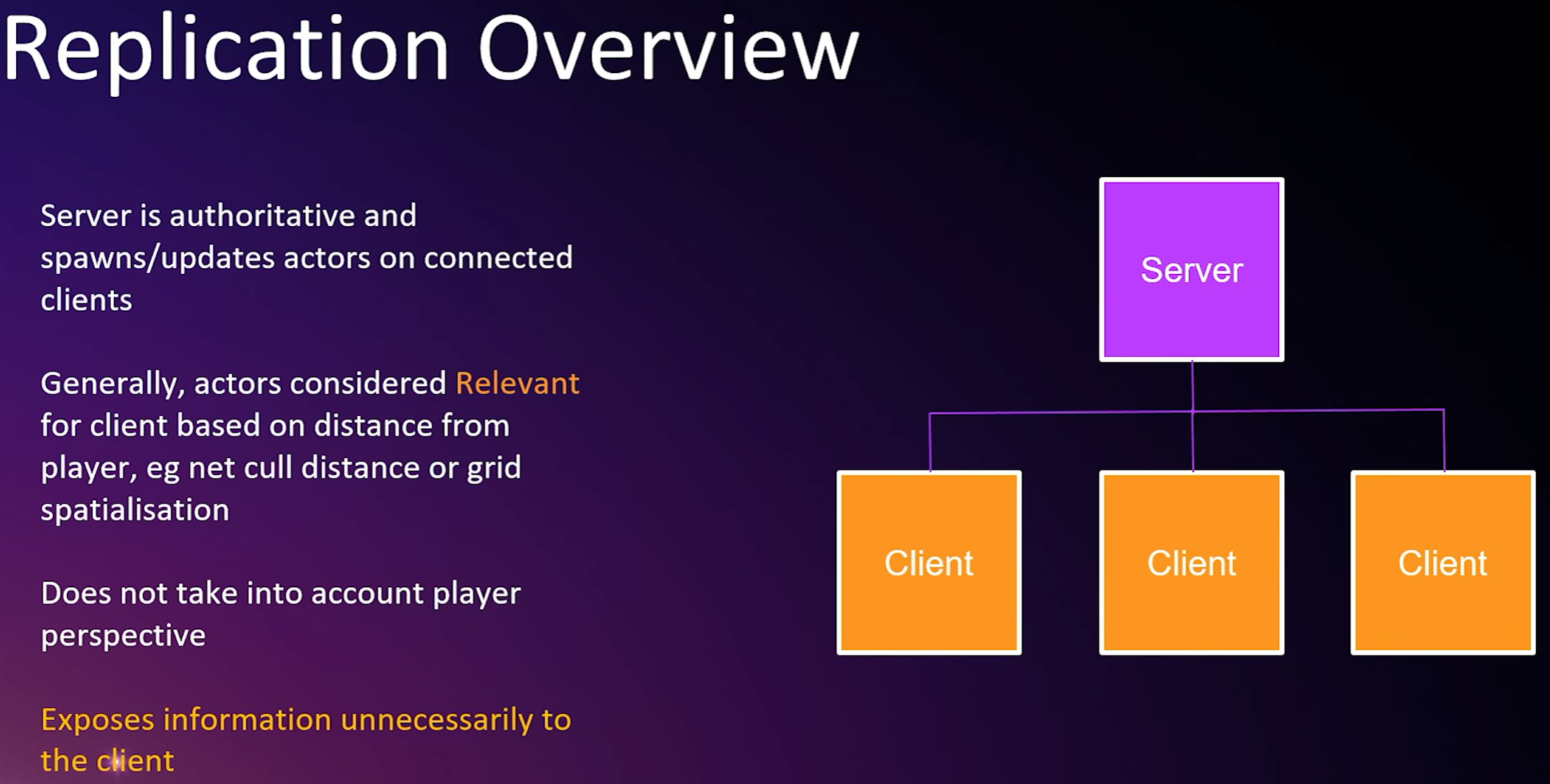 Okay, so to talk about how we fix the problem, I'm going to go into a little bit on why it happens. to cover some basics, the architecture of a multiplayer game like ours is that there exists a central server which contains the game state, it knows everything about the game and coordinates the action amongst multiple game clients. the process by which clients kept up to date about what's happening in the game is called Replication. For example, to simplify a little bit, when a client joins the game, an actor representing that player is replicated across all the clients in the game. And as they move around the world, their position and other attributes are continually replicated as well. And this goes for the enemies, loot crates, and other game objects in the world. and is essentially what drives the immersive multiplayer experience. when an actor should exist on the client and receive updates, we call it relevant for that client. Common relevancy metrics used by Unreal's replication system are to use distance from the player. For example, each actor has like a NetCullDistance outside of which that actor will stop being replicated for that client. And there are other systems such as GridSpatialization2D which apply that concept to optimize for open worlds and actors. what these systems don't take into account is what a player can see or what they should be able to see and hear. So they expose that information unnecessary to the client.